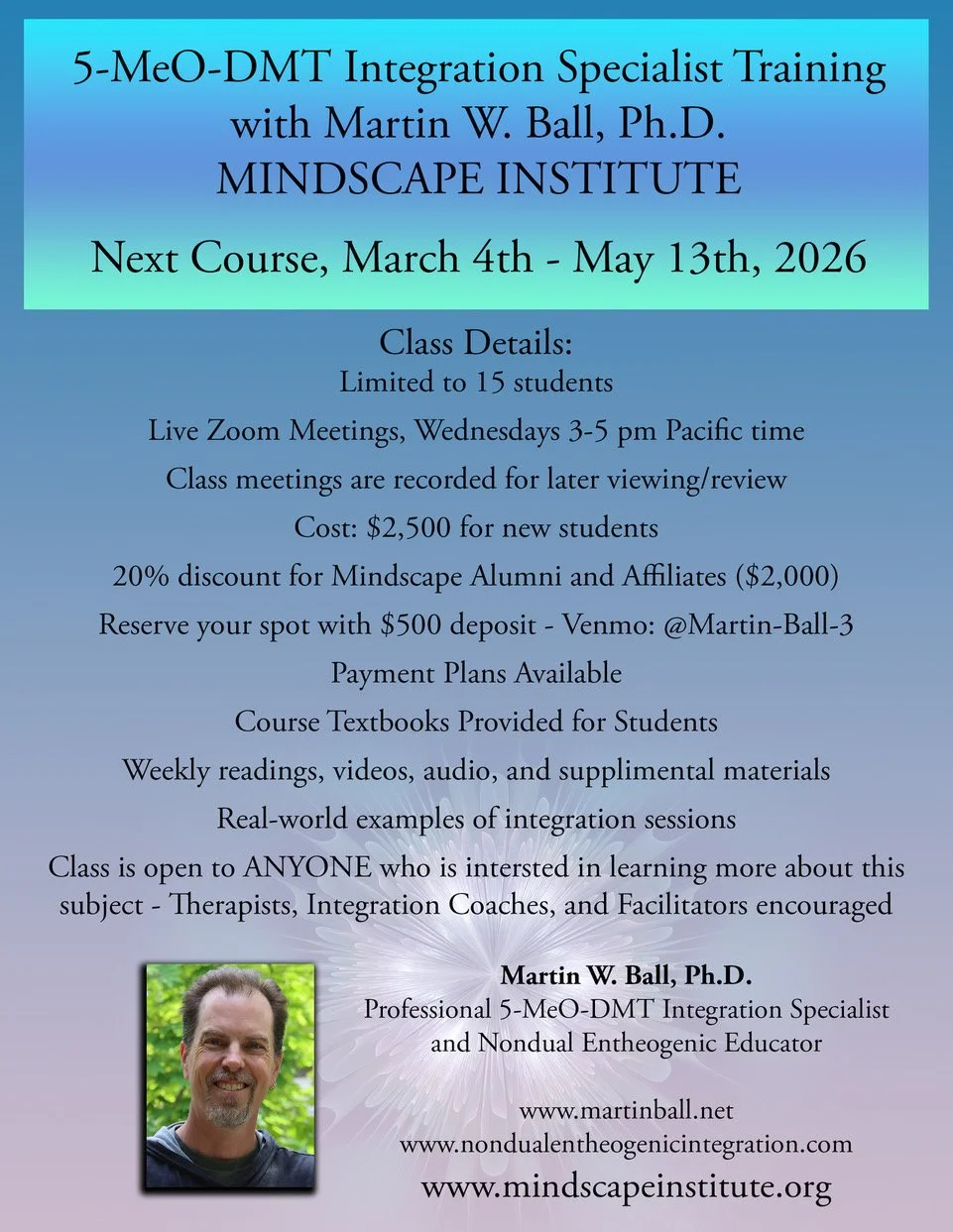 This 9-week course is the first of its kind in the world: providing direct classroom instruction on how to be an integration specialist and coach with a focus on the unique properties of 5-MeO-DMT as taught by the person who wrote the book on the subject.